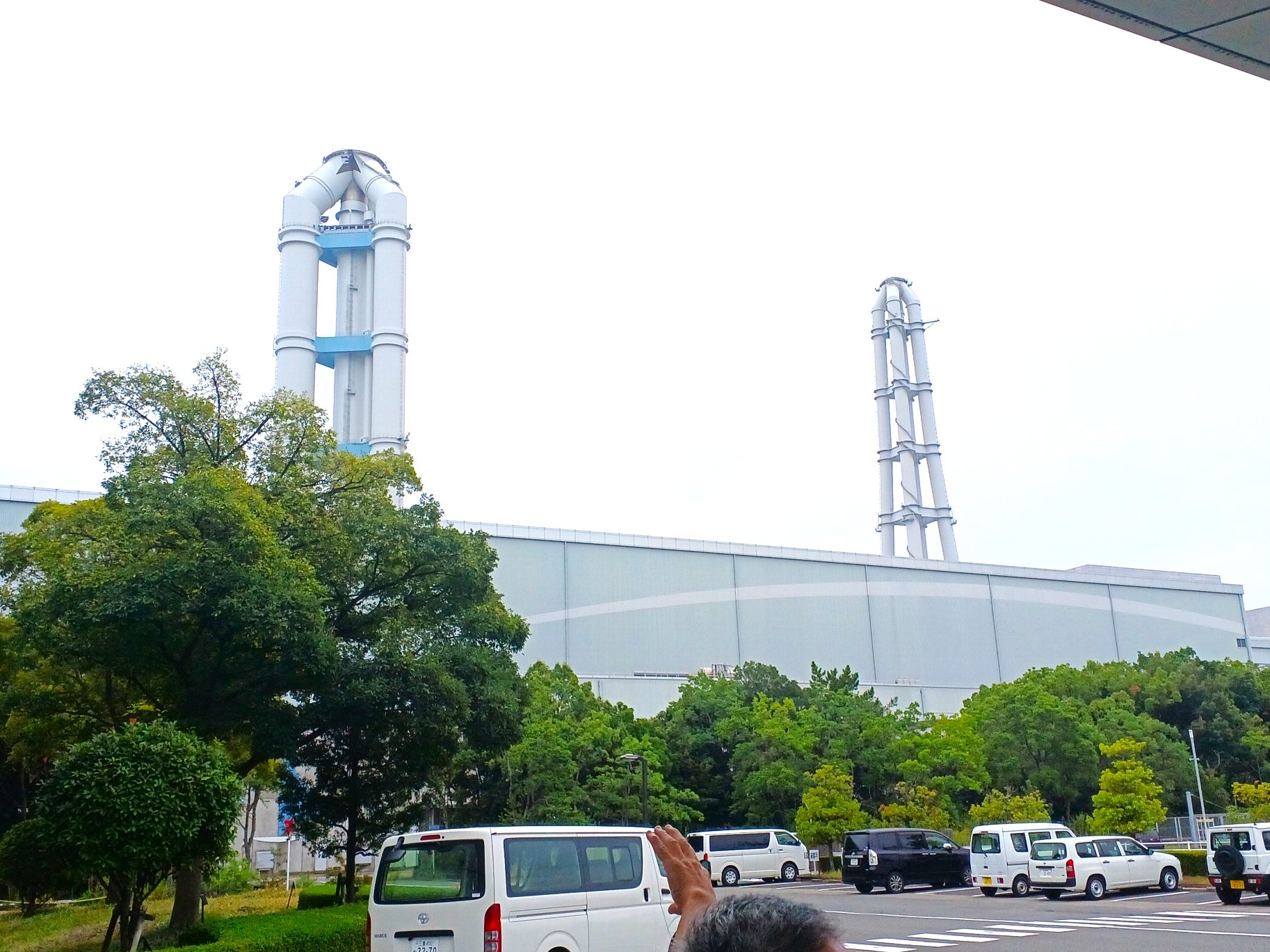 2本の高い煙突があって、高さは200mで太さは新幹線の車両が通れるくらいだそうです。外気温が低いときに煙突から白く立ち上って見えるものは、煙ではなく水蒸気だそうです。
