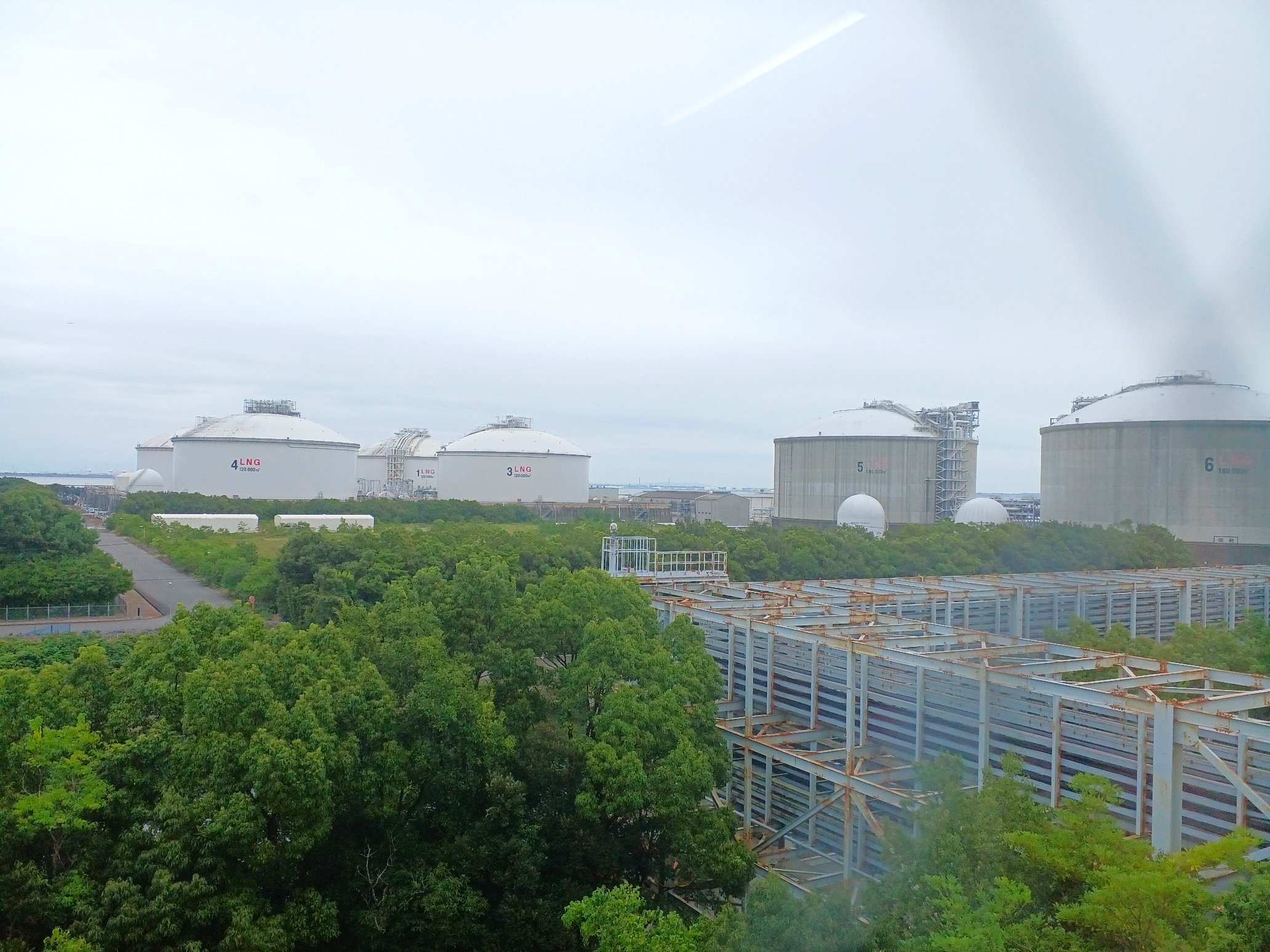 窓から海の方を見ると、LNGの大きな貯蔵タンクが6基見えました。1週間に2回ほどタンカーが入ってくるそうです。