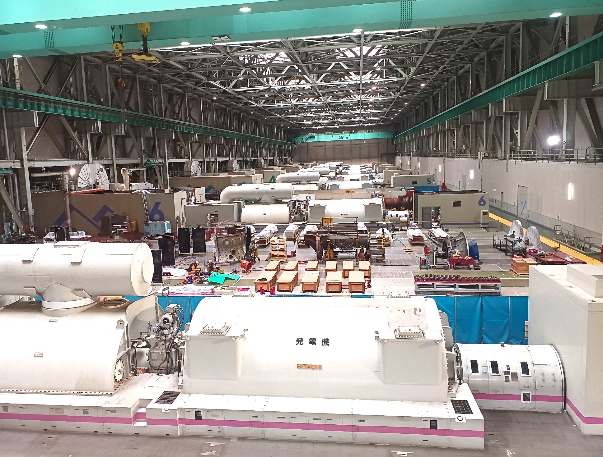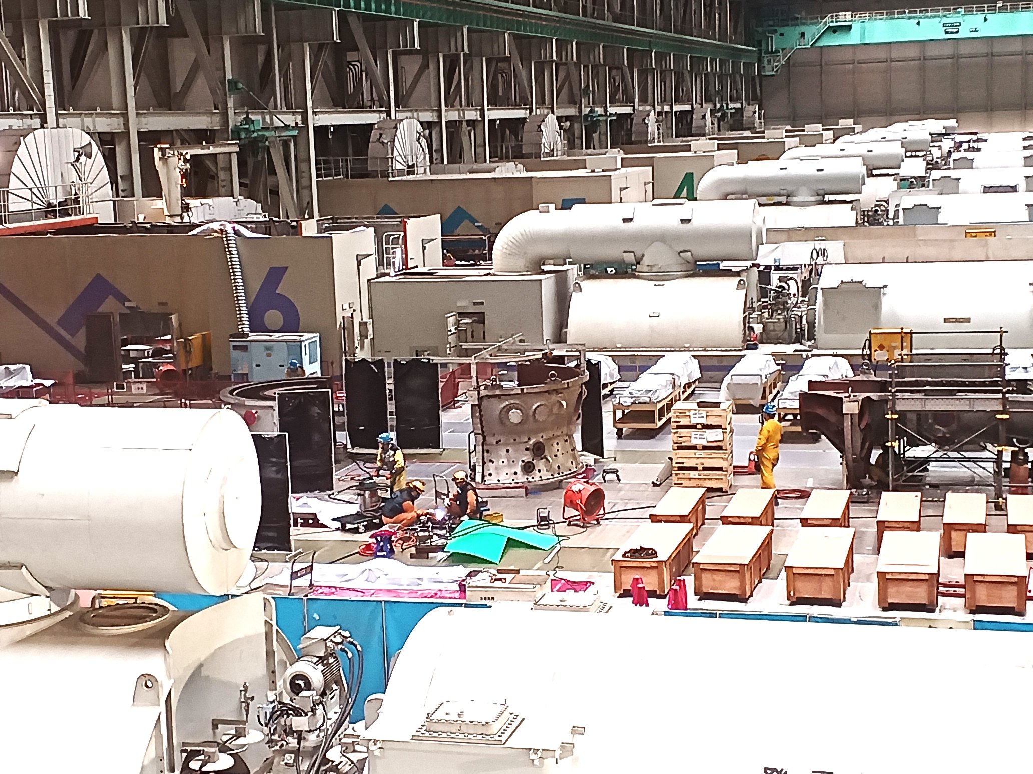 発電所内のプラント建屋内部も見学させてもらいました。3号・4号系列にそれぞれ7つのラインがあり、そのうちの3-6番のラインがちょうど分解点検中でした。建屋内部は80デシベル程度の騒音レベルだそうです。