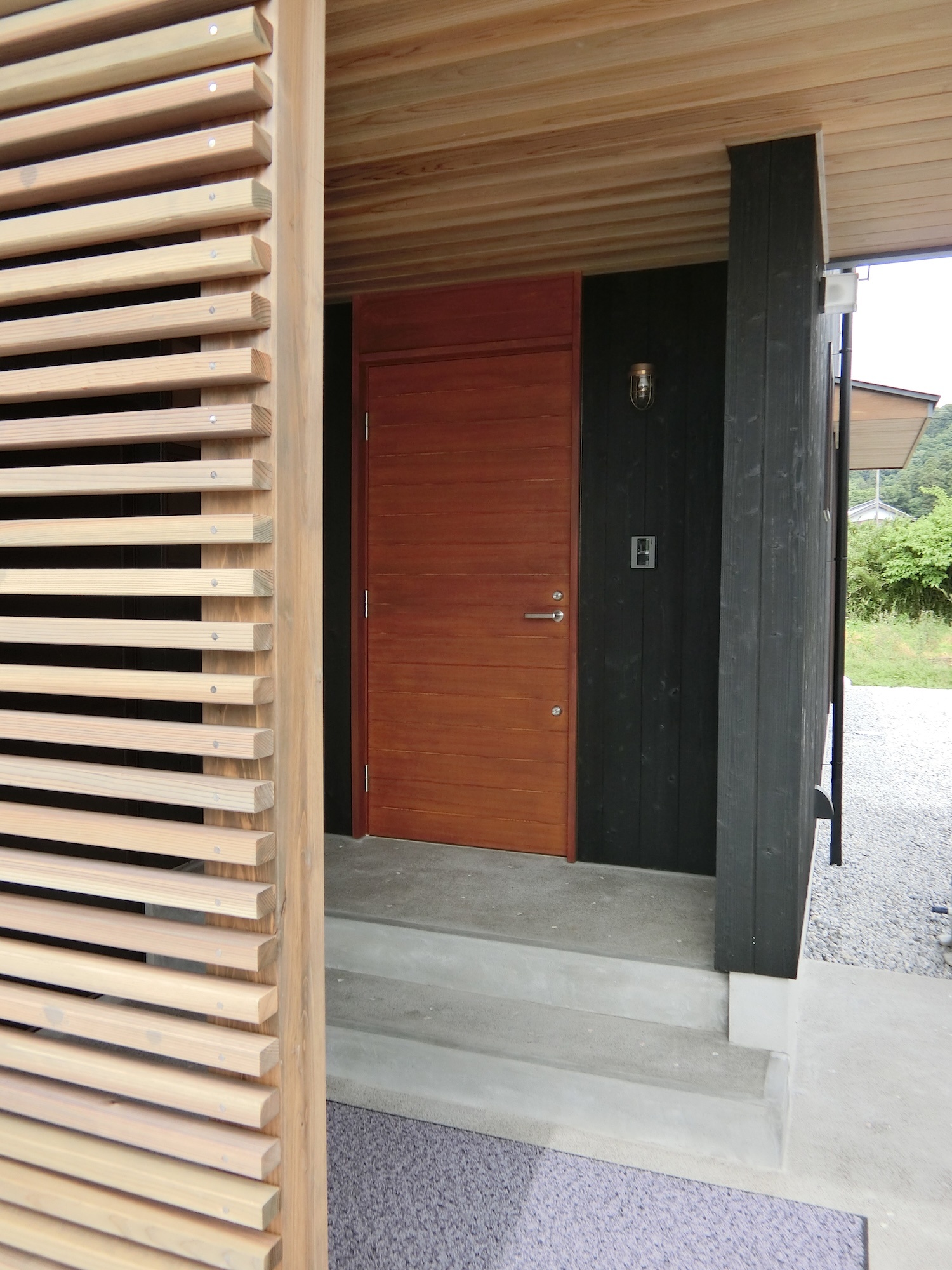 玄関前には木材格子を設置。目隠し&日除けの役割を果たしてくれます。施主さまこだわりの焼き杉板を用いた黒色の外壁とのコントラストが絶妙です!