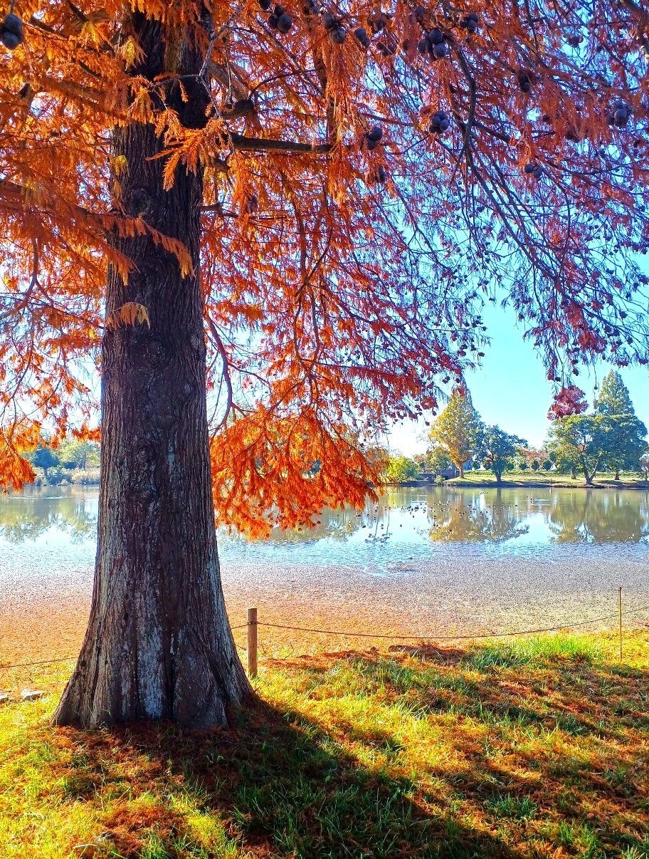下のフランス印象派の絵画のような風景のこの木は「ラクウショウ」というらしく、有名な「メタセコイア」とそっくりです。北アメリカ原産の落葉針葉樹で、葉っぱがひらひらと羽のように落ちることから「落羽松」と漢字では書きます。大きな実をつけるところがメタセコイアと区別をするポイントのひとつです。