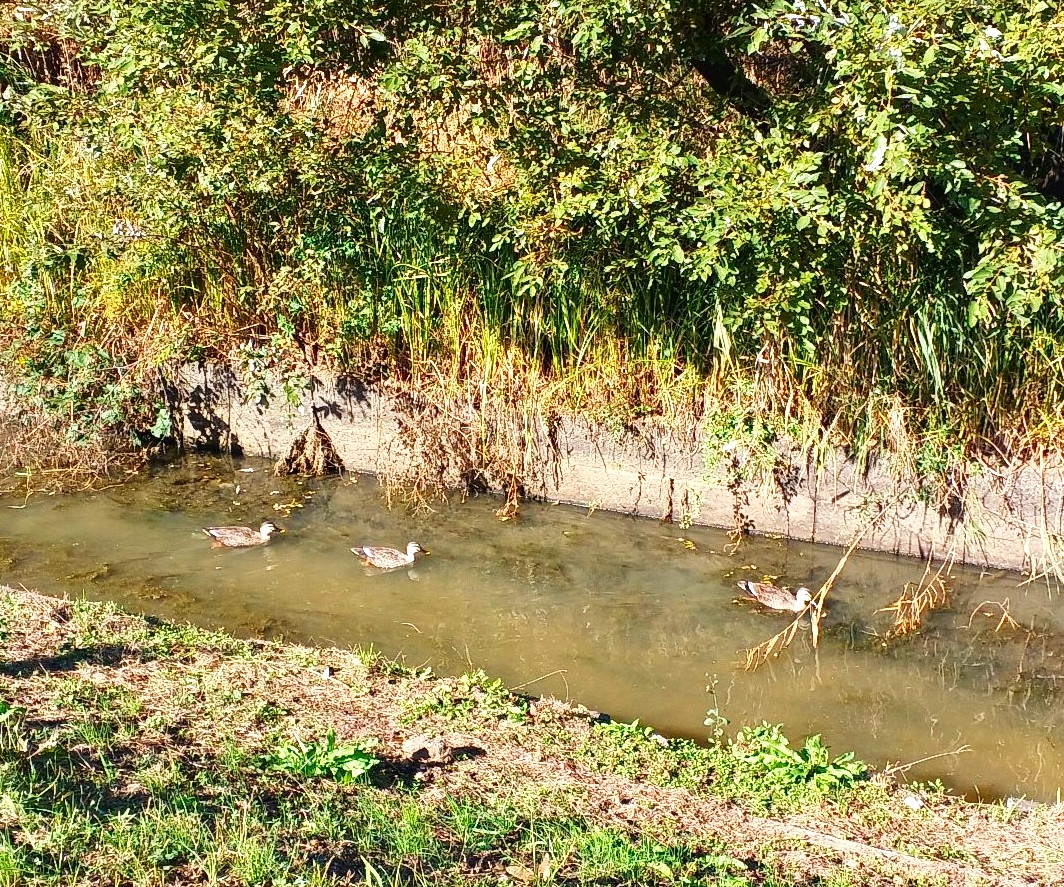 わきの水路には小さな水鳥が泳いでいますが、これはくちばしの先の黄色い「カルガモ」で特に冬に来ているのではなく、通年琵琶湖にはいるとのこと。