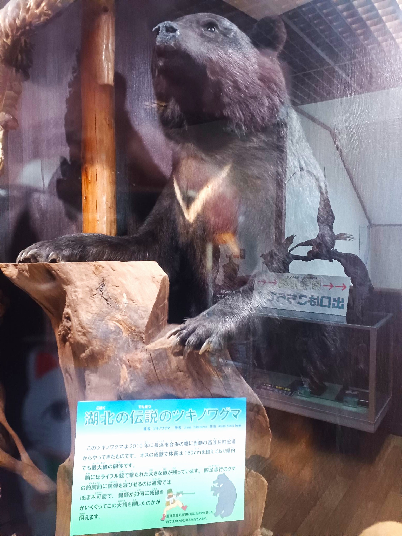 この施設の中にはいろいろな生物の展示がしてあるのですが、びっくりしたのは大きなツキノワグマのはく製でした。