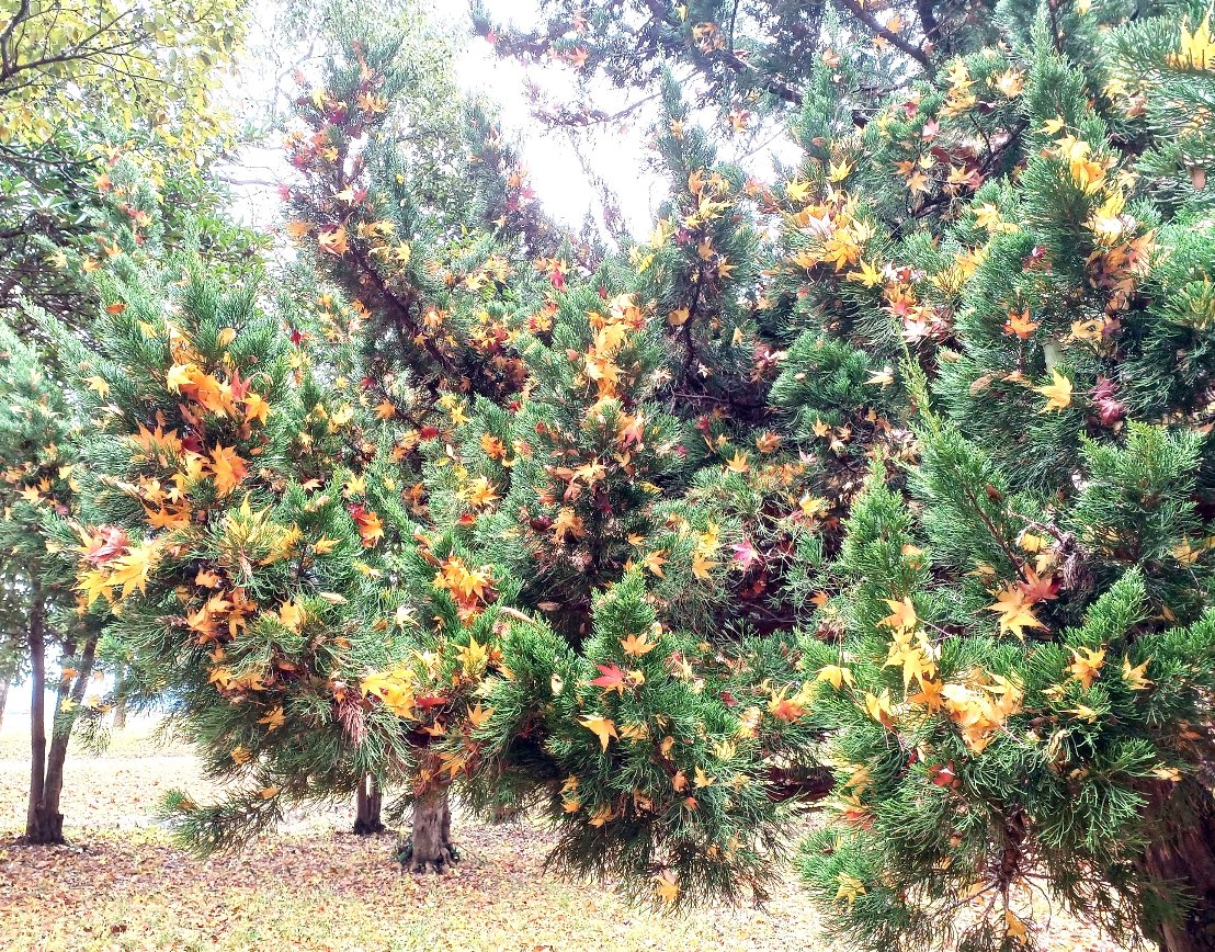 常緑の針葉樹に黄色い花か実みたいなものがついているのです。何だろうと思って近づいてみると、イトヒバ?とみられる木に、花でも実でもなくモミジの葉っぱが見事にデコレーションされているのです。