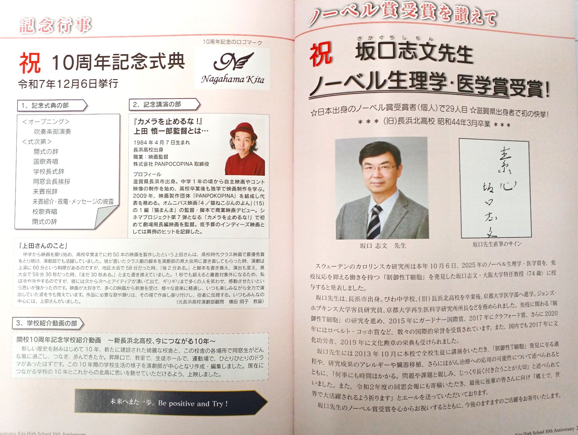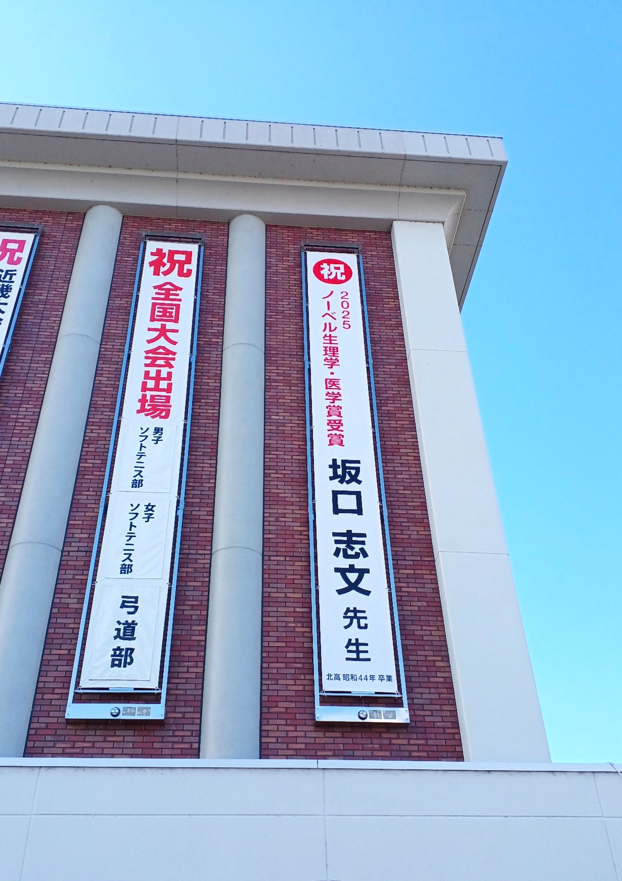 全国で活躍している同窓生は数多くいらっしゃいますが、もっとも有名なのは何と言っても今年ノーベル生理学・医学賞を受賞された坂口志文先生です。私より6年先輩で、式典のときにはちょうどスウェーデンでの授賞式に出席されており、母校へメッセージをいただきました。