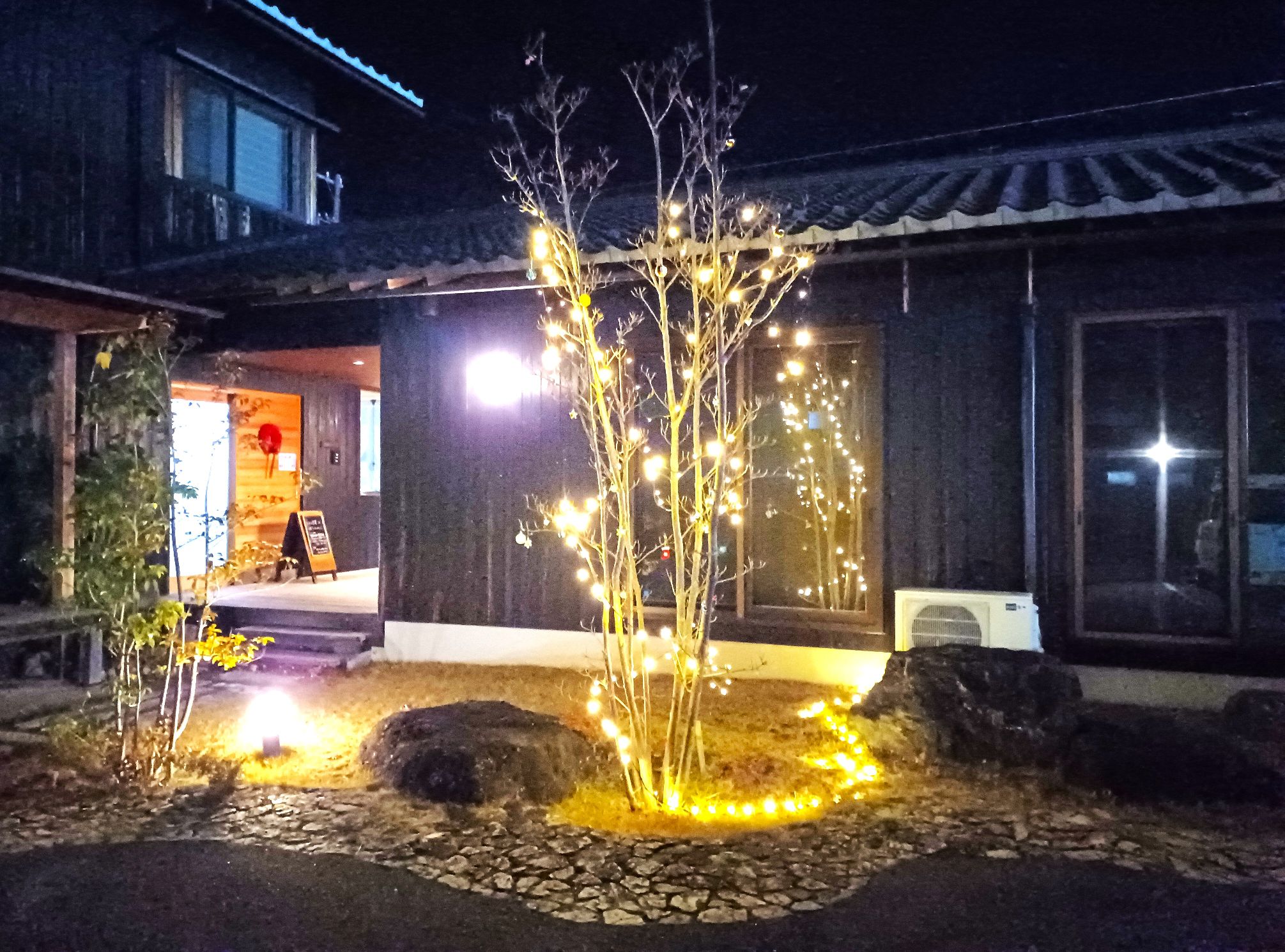 国友トータルサービスの裏庭には、クリスマスツリーとは言えないですが、ささやかながらイルミネーションが光っています。