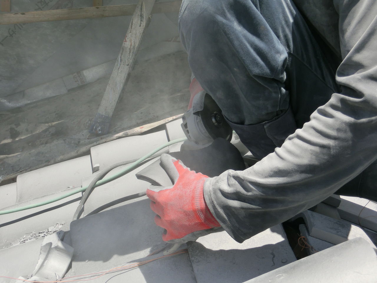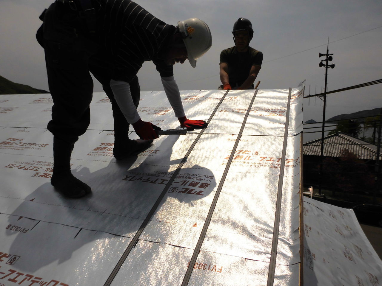 瓦屋さんが屋根の防水シートを施工中のひとコマです。
