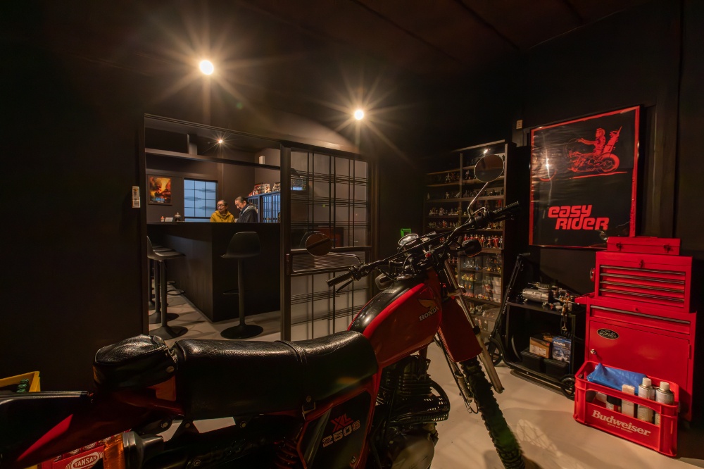 趣味のオートバイの話しでも意気投合し、客席から眺められるインナーガレージも併設。