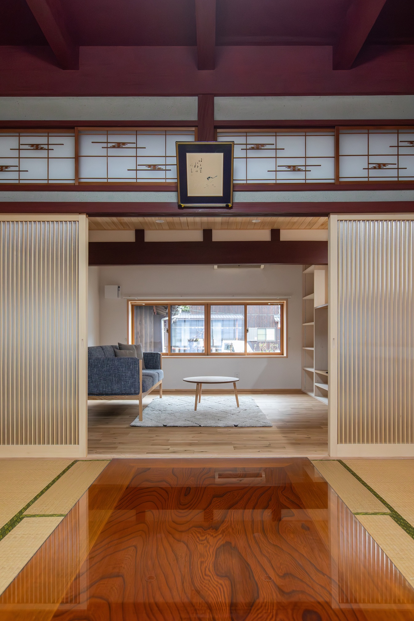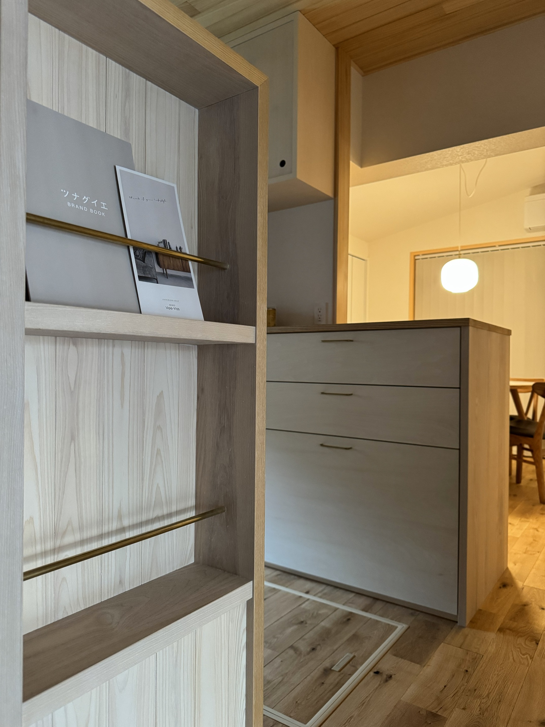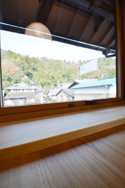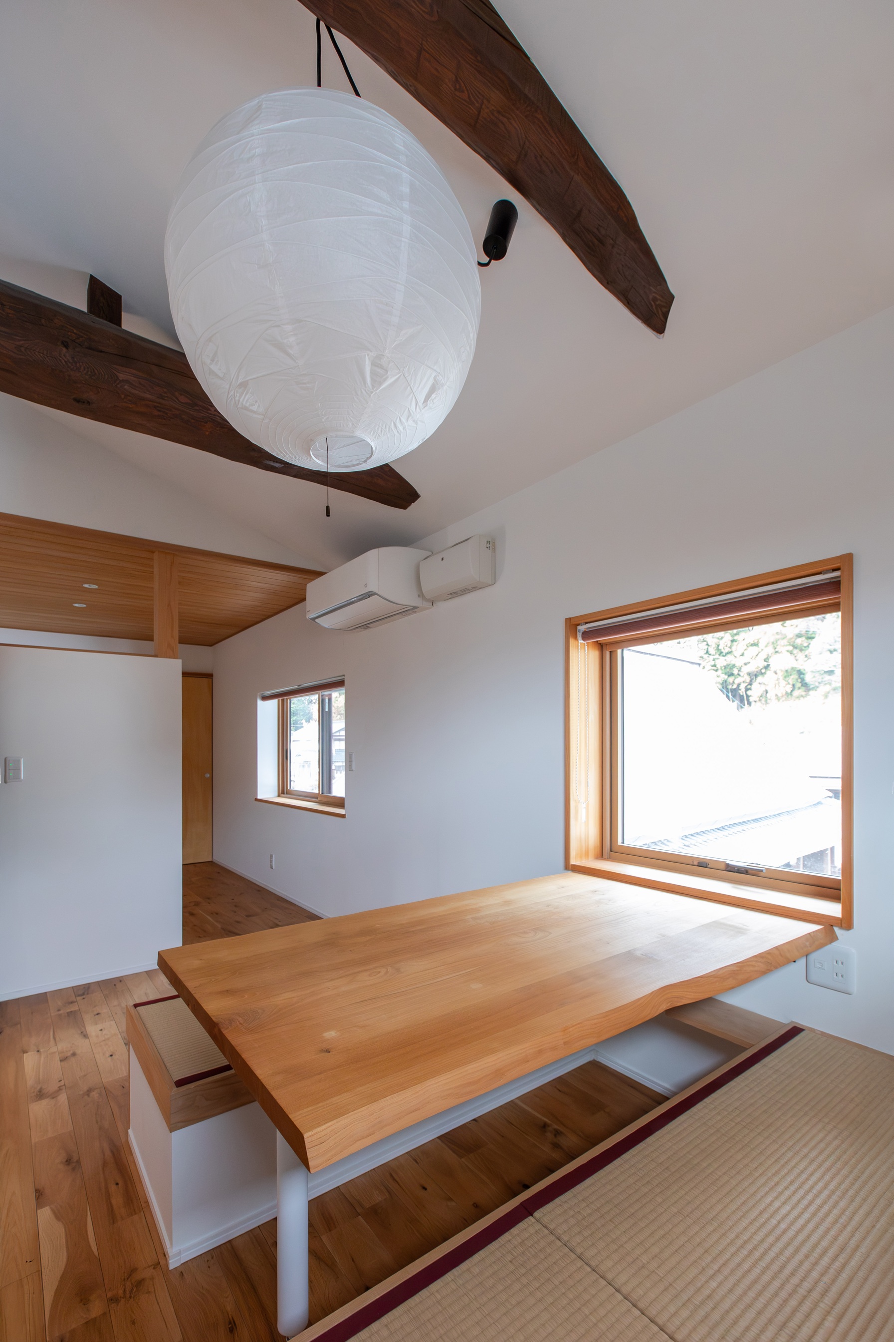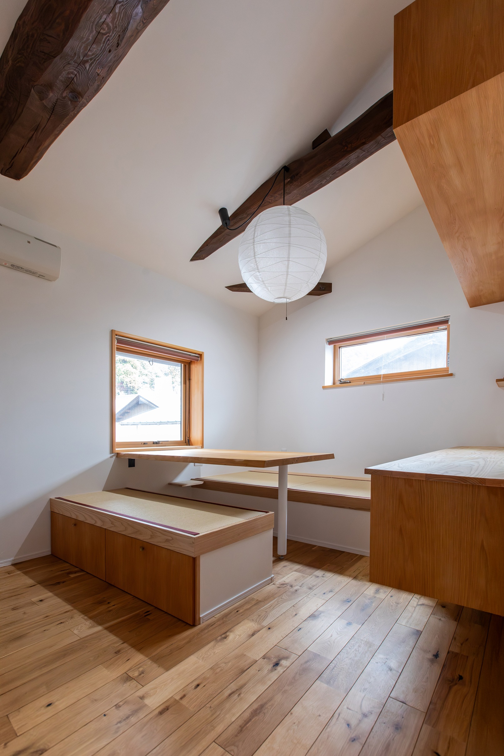 自然素材で仕上げた空間に栗材のテーブルと畳ベンチを設置。テーブル横の窓辺から里山の豊かな自然を眺めることができます。春には桜、秋には紅葉。室内にいながらも自然の光が差し込む屋外とつながり続けるくつろぎの場となりました。(2階は6年前の2019年にリフォームを施工、今回の1階のリフォームにて統一された空間へとなりました)