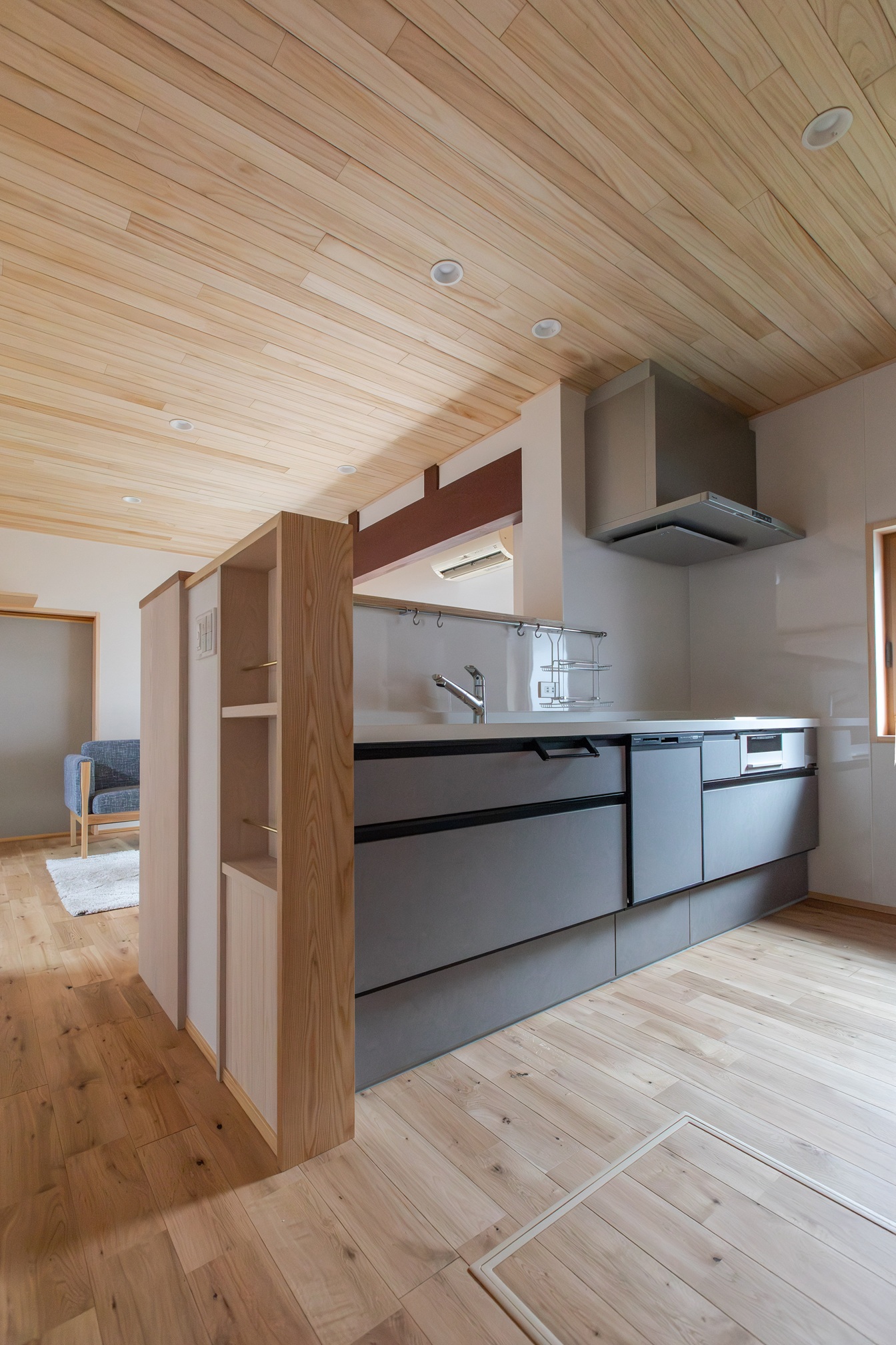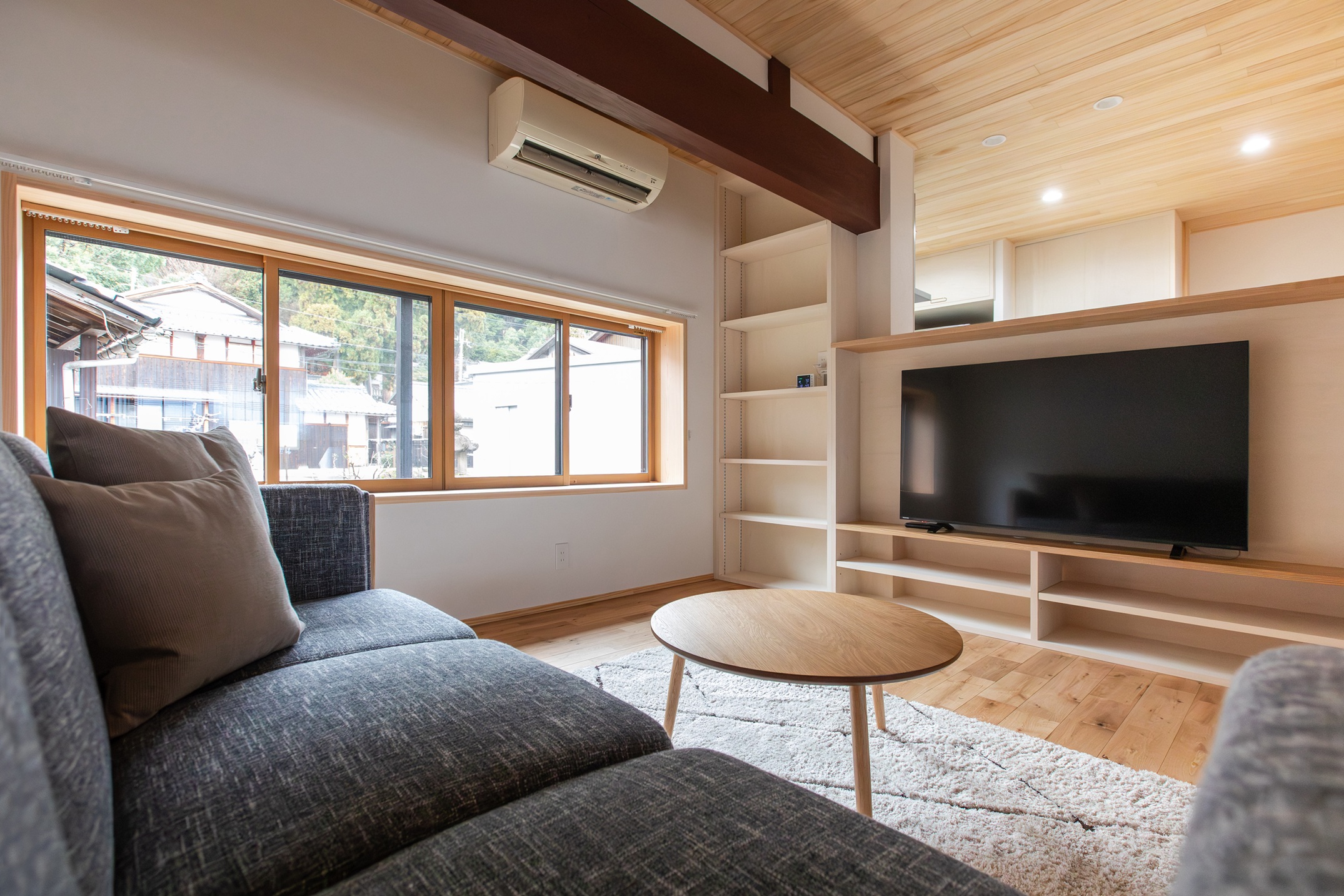 もともとは隠れていた重厚な丸梁を磨き現しにした天井は、開放感いっぱい。杉板張りにすることで開放感だけでなく空間に落ち着きを持たせています。